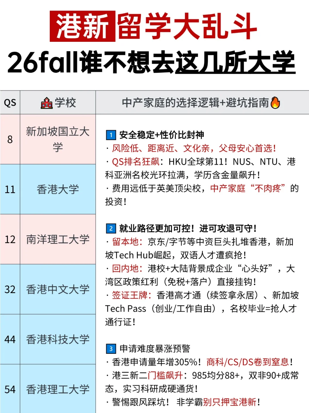 考虑港新联申,注意新加坡国立、南洋理工提前批,雅思6.5+是基础门槛,可作为保底准备。