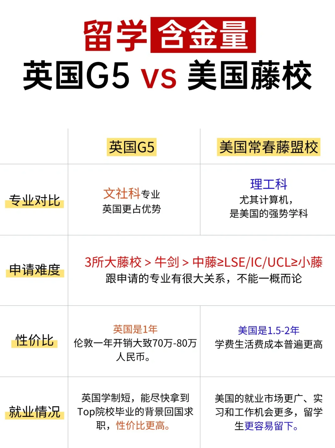 一般来说,理工科的同学会认为美国是更优选择。尤其是计算机,是美国的强势学科,英国相对较弱。 但是如果你的专业是文社科,英国就更占优势。像牛津大学的人类学、英语语言文学世界第—,UCL多年拿下教育学、建筑学的世界第—。