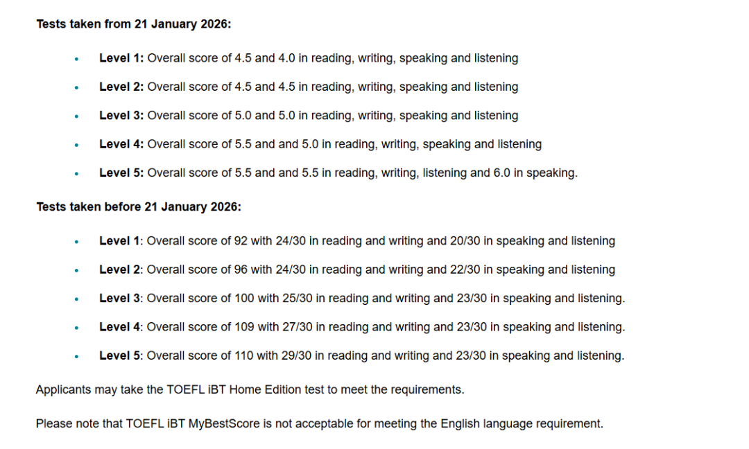 根据UCL官网的最新消息,其入学语言成绩政策已更新,UCL将继续认可2026年1月21日后托福考试成绩!