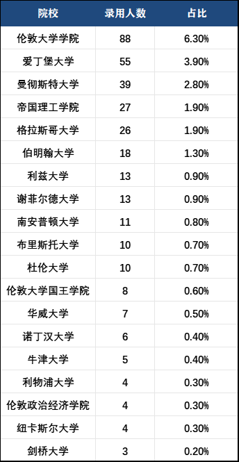 根据已公布的数据,今年留学生录用占比46%,毕业于英国高校的学生占据了将近1/4(24.7%)的雇佣份额。
