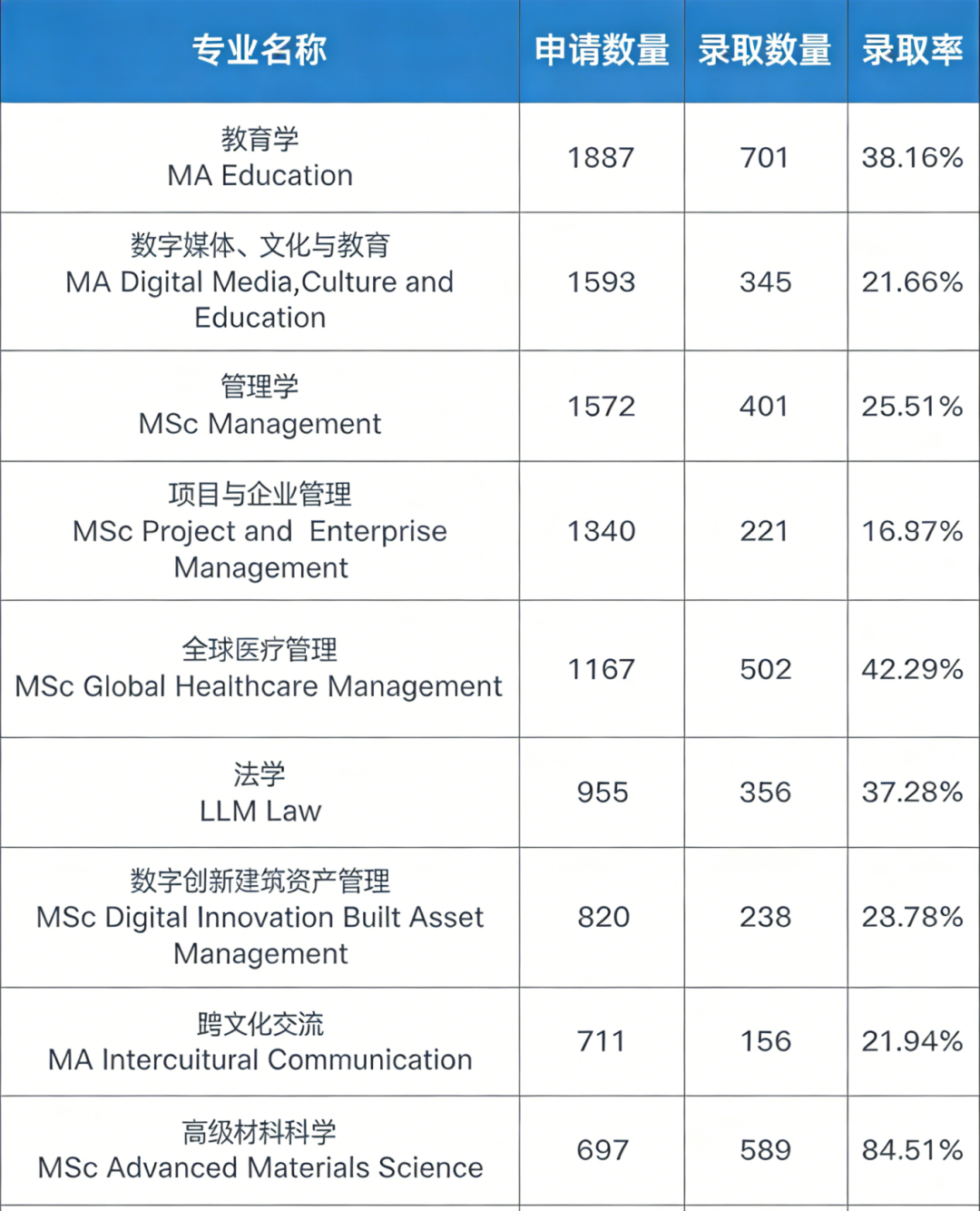 作为UCL东校区23年首批新专业之一,全球医疗管理申请数量达到1187人,录取率42.29%超过教育学。