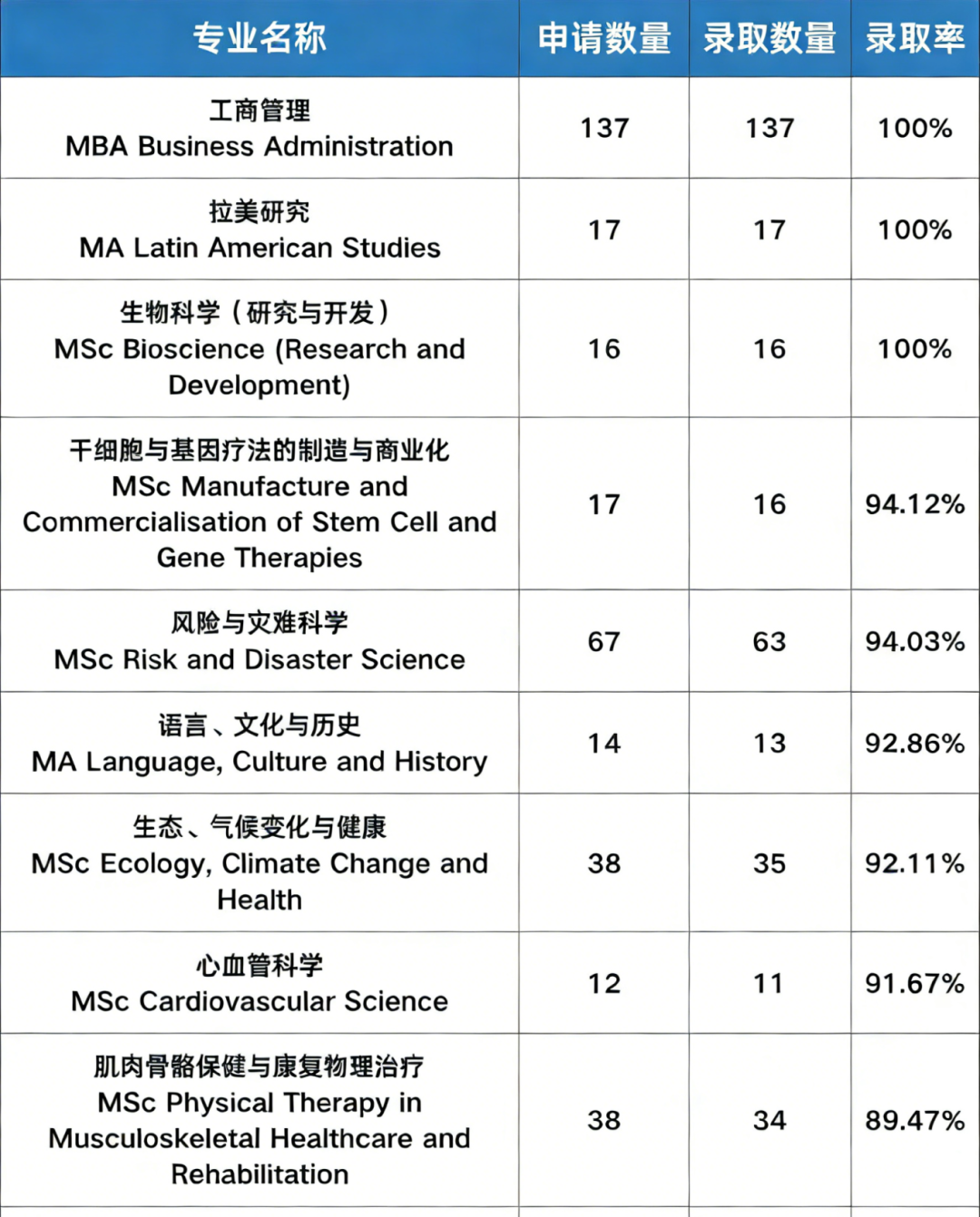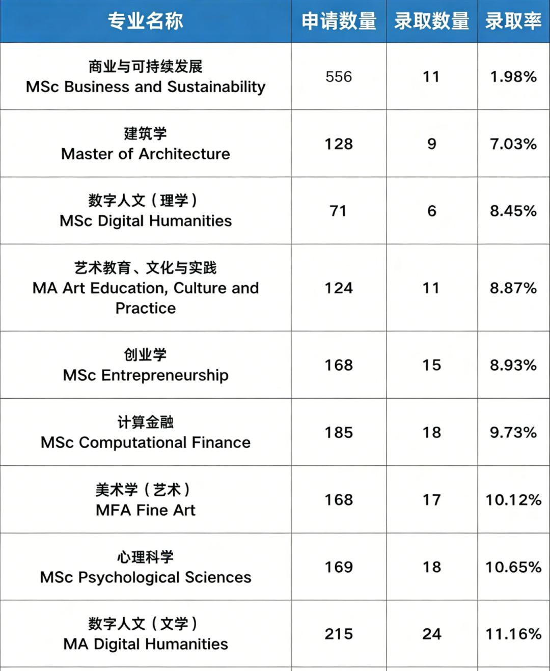 UCL录取率高的专业一般都要求申请者有强相关的专业背景!这些专业申请量最高的MBA专业也仅有137人。