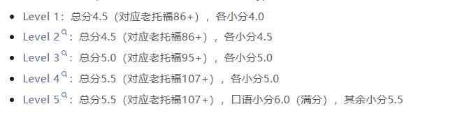 UCL把所有被接受的语言测试按照Level1-5进行分类,参加新托福考试的同学,成绩每个Level对应的托福总分与单项如下: