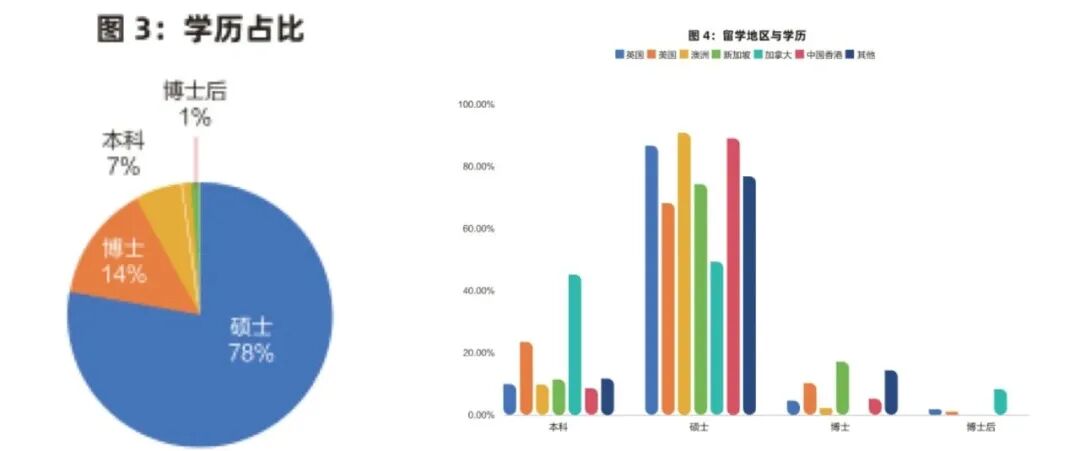学历分布上,海归硕士占比高达78%,是求职的绝对主力;博士占比14%,本科生仅7%。