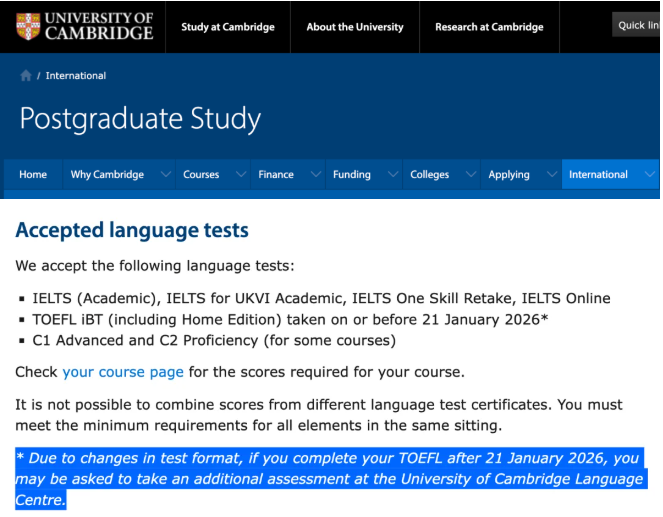 硕士申请:26年以后参加新托福考试的申请者可提交托福成绩,但需额外参加剑桥自主命题的语言测试!