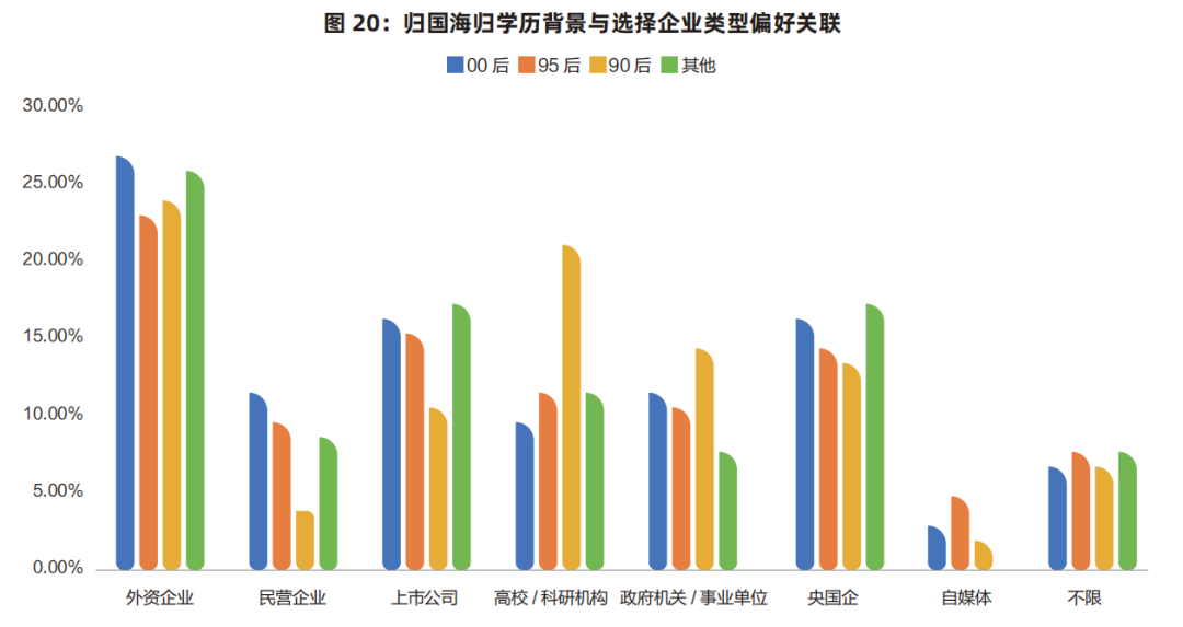 从企业类型看,求职者也体现出代际差异:外资企业因为青睐留学生、语言优势突出、福利完善,成为各年龄海归首选!